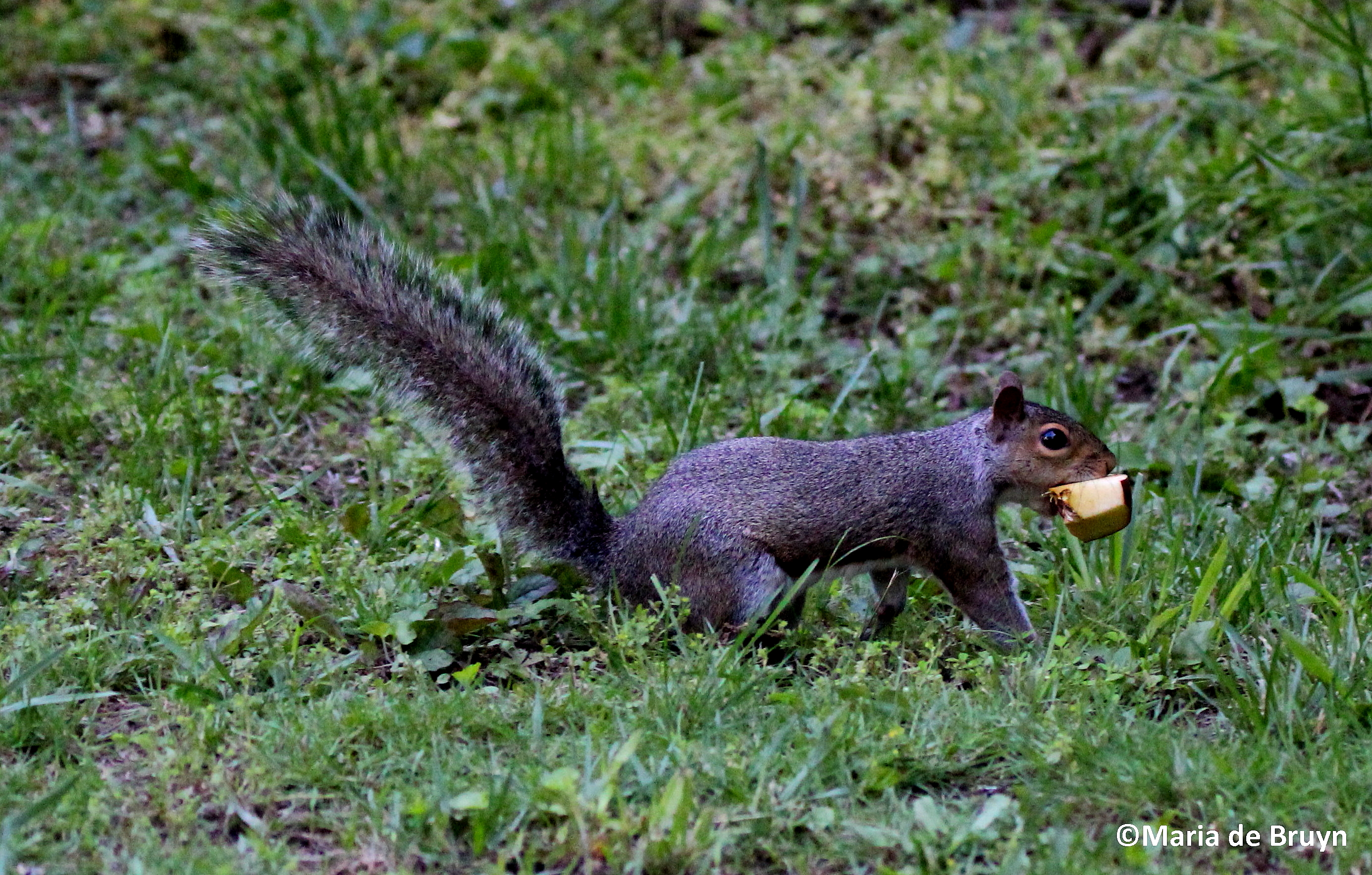 As you may know, our furry, agile, smart little friends, the Eastern gray squirrels (Sciurus carolinensis), are fond of all kinds of vegetable matter. Acorns, nuts and seed are a favorite: they will chew through the screen of a backyard porch to get to bird seed (as my neighbors learned after leaving a bag of it there), chew through the plastic lids of food buckets in which I was keeping bird seed outside (the seed is now kept indoors) and spend lots of time contemplating how they can overcome baffles and other barriers designed to keep them off bird feeders.