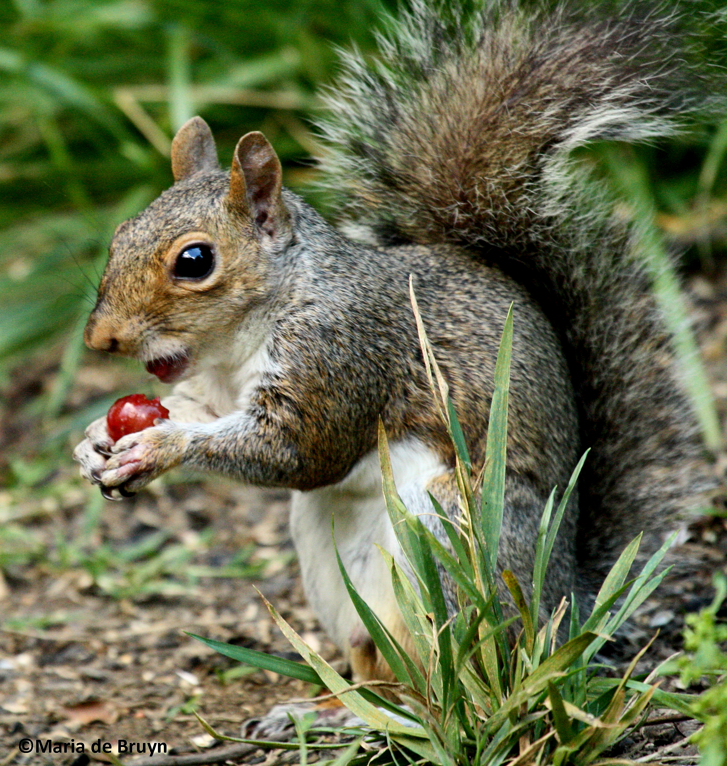 I must admit, though, that I had not expected to see a squirrel assiduously burying grapes one day. Researchers have found that that they will eat the most perishable acorns right away, while caching those that will stay preserved the best. So what made this squirrel think that the grapes she was burying would last underground? Unless this was one sneaky squirrel who was just temporarily hiding her/his bounty until s/he could enjoy those grapes in relative solitude.