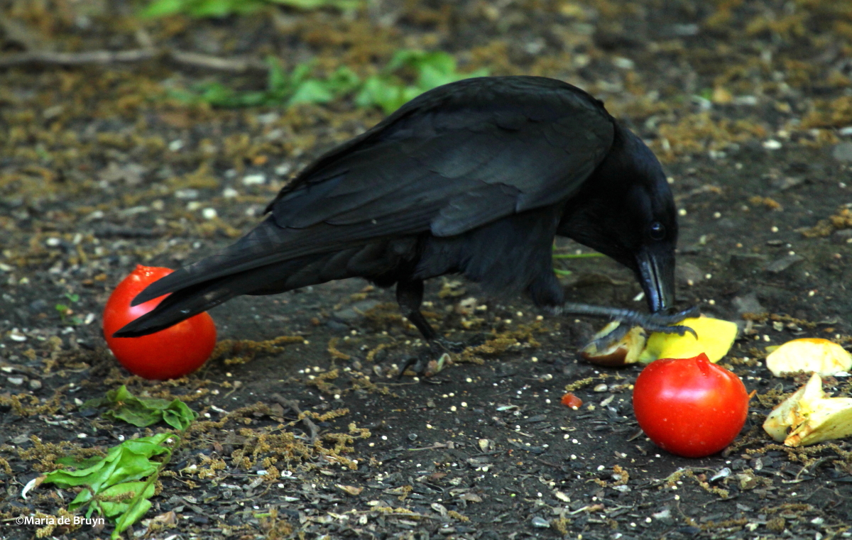 In years past, I have had the occasional American crow (Corvus brachyrhynchos) visit my yard. For example, this past spring when it was snowing, a few came to eat fruit but they never really hung around – except for one that flew in with a half-eaten squirrel (or rabbit) that it was reluctant to leave behind.