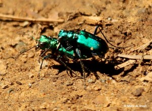 Leaving the pond, I entered the woods again and witnessed a pair of six-spotted tiger beetles (Cicindela sexguttata) engaged in mating, but it was not with mutual consent. The iridescent blue male jumped on the greenish female, who did her best to escape. He literally tackled her and at one point had her on her back as he kept hold of her.