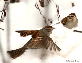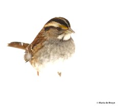 The white-throated sparrows (Zonotrichia albicollis) have an opposite feeding strategy, usually feeding on the ground and occasionally venturing up to a feeder. They, too, searched under the snow for some food.