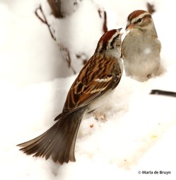 First up are the sparrows and warblers. The chipping sparrows (Spizella passerina) usually get their seed from the hanging feeders in the front and back yards but now they were looking everywhere for a bite to eat. I had strewn some seed on the ground and they began looking there.