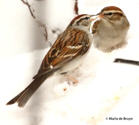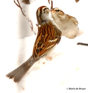 One found a trove of food and another came by asking to be fed, a request the first sparrow accommodated quite sweetly.