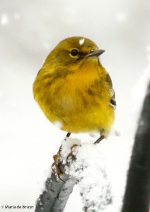 The pine warblers (Setophaga pinus) tend to be rather shy; only very rarely does a pair visit together. Mostly, one shows up at a time; their beautiful yellow color was really highlighted against the white background.
