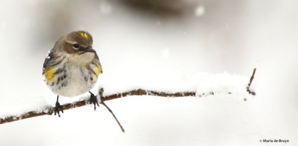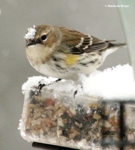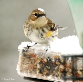 The pine warblers did have to brave a bad-tempered bird to get to the feeders. One of the six resident yellow-rumped warblers (Setophaga coronata) has become very territorial, chasing away some other yellow-rumped warblers, the ruby-crowned kinglets and the pine warbler – in other words, the birds his size or smaller. He allows a couple other yellow-rumps to feed peacefully and I think perhaps they are his family members so that he tolerates them. He didn’t stop the other small birds from coming around, however, as we’ll see in the next blog.