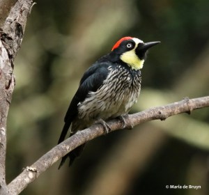 A group of five acorn woodpeckers (Melanerpes formicivorus) came to enjoy the fruit, perfectly willing to share the space with the other birds. These birds, which are also seen in the Western USA, do eat lots of different nuts but insects and fruit are obviously also desired meals.