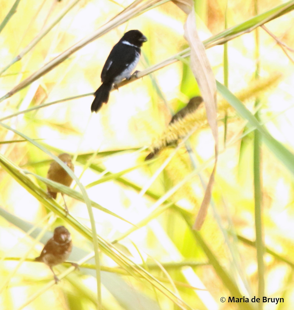 A fair amount of time was spent looking at shorebirds enjoying the water at the San Isidro sewage lagoons. This was not my favorite spot – it didn’t smell bad but the lighting was awful, the birds were far away behind fences that I couldn’t photograph over or through very well. I did manage a photo of a mangrove swallow (Tachycineta albilinea) zipping over the water in the distance. The photo of the variable seedeater (Sporophila aurita) was in dense shrubs and then I over-compensated – but you can see the male is black with a white mark at the neck and the females are brown.