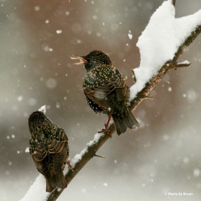 The starlings look nice and peaceful when they sit still on a branch or rest on the snow-covered ground. When they fly up to the feeders, however, I sometimes chase them off. They used to only eat a bit of seed but now have also developed a taste for dried meal-worms and even suet. When a gang of 8-12 come, they can empty feeders in about 20 minutes. ANNOYING! (Both for me and the other birds!)