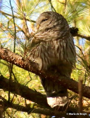A couple weeks ago, I was startled by this barred owl who suddenly flew in front of me from behind my right shoulder. I hadn’t noticed him/her in a tree behind me. I tried to follow its flight but lost it. I thanked the owl for letting me glimpse it and said it would be nice if s/he came back so I could get another look. Sure enough, after I had turned back to the vicinity where I originally was surprised by the silent predator, it flew in and perched on a branch. The bird had a snooze, keeping one eye partially open to keep me in view.