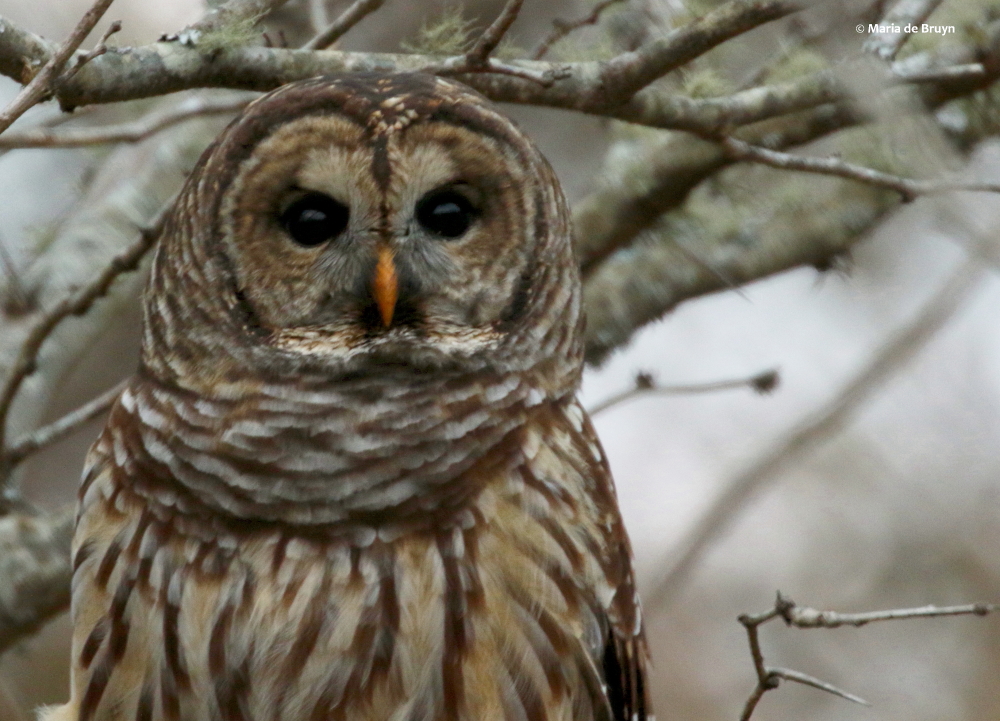 I’ve been lucky lately in seeing barred owls (Strix varia) at the Brumley Nature Preserve North. This owl was sitting silently next to a walking path, looking out over the adjacent field.