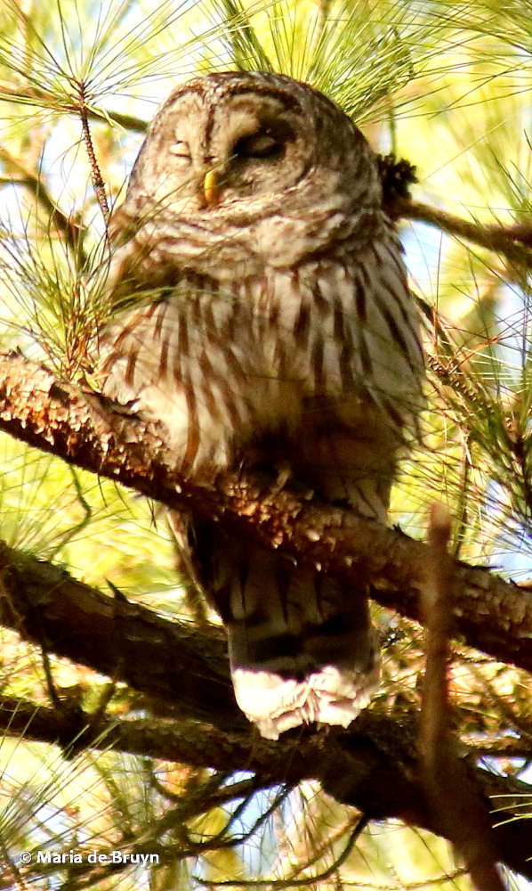 A couple weeks ago, I was startled by this barred owl who suddenly flew in front of me from behind my right shoulder. I hadn’t noticed him/her in a tree behind me. I tried to follow its flight but lost it. I thanked the owl for letting me glimpse it and said it would be nice if s/he came back so I could get another look. Sure enough, after I had turned back to the vicinity where I originally was surprised by the silent predator, it flew in and perched on a branch. The bird had a snooze, keeping one eye partially open to keep me in view.