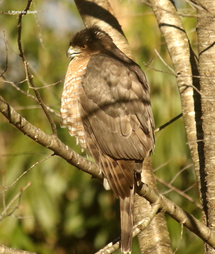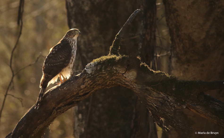 A Cooper’s hawk (Accipiter cooperii, left) sometimes frequents my yard looking for a bird to take. This particular day in November last year, the hawk flew to the front-yard feeders but came up empty-taloned. Raptors, also known as birds of prey, are not the only birds that eat something other than seed. Some smaller birds, like the shrike, do so and many songbirds eat insects. The raptors, however, often go after prey that is fairly large in comparison to their own body size. In January this year, I came across another Cooper’s hawk at a nature reserve. The bird flew soundlessly past me to land in a tree downslope and paused for a bit before flying on, providing time for me to get a gorgeous portrait.