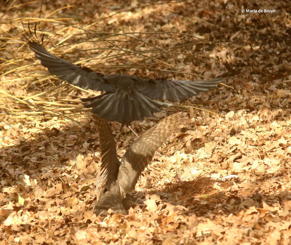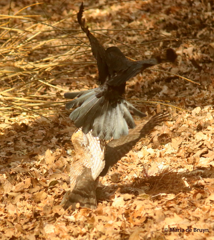 A couple weeks ago, our neighborhood family of American crows (Corvus brachyrhynchos) was making a racket in my yard and when I looked out the window, I could see them harassing a hawk. I couldn’t make out why they were so angry but grabbed my camera for some shots through the window.