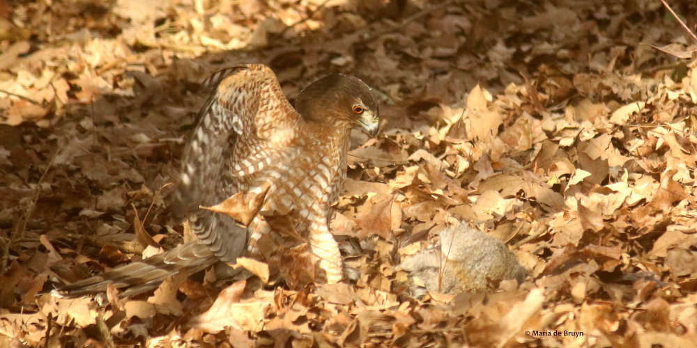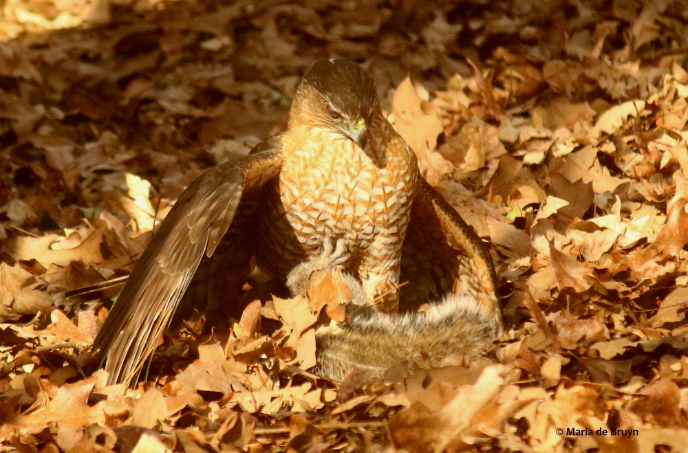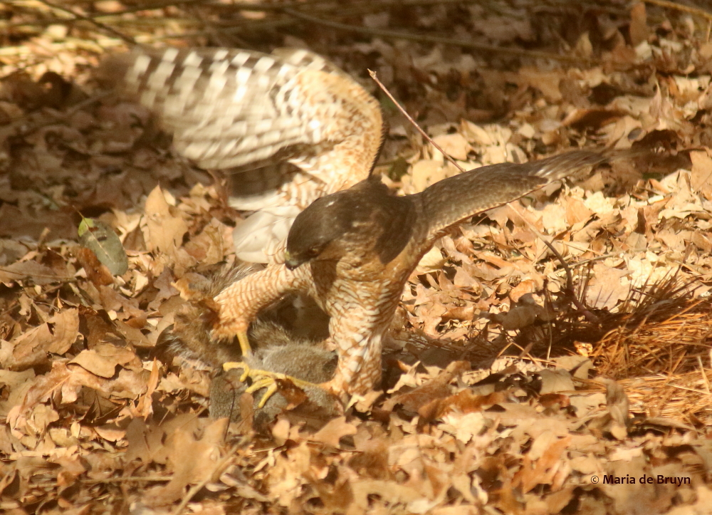 It turned out that the Cooper’s hawk had caught one of the numerous Eastern gray squirrels that live here. The squirrels sometimes annoy me but on the whole, I enjoy watching their antics, so I felt badly for this squirrel, who obviously was not going down without some struggle.