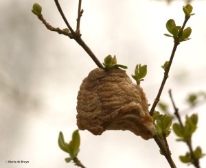 With the leaves having fallen from most trees, it’s possible to see the cocoons of some of our larger moths. So far, I’ve found three cecropia moth cocoons, two polyphemus moth cocoons and several bagworm moth cocoons in three different places. The Chinese praying mantis (Tenodera sinensis) egg cases are also showing up better with little foliage to hide them.