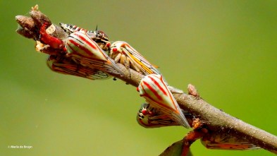 As you can see, the oak treehopper is quite a beautiful insect with its pristine white body decorated with pink/red stripes and hints of yellow. They made me think of mints and Candy Stripers (a sign of our times when almost anything makes me think of health and health-related concerns. For younger readers: young female volunteers who work under nurses’ supervision in hospitals used to wear pink and white striped smocks and thus got the name Candy Striper).