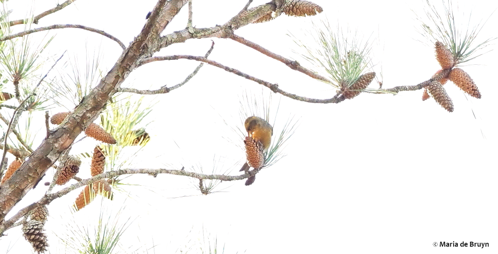 I was not enthusiastic about going to a hunting zone but had heard that the duck hunters were usually only busy early in the morning. So I donned my bright orange vest and ventured out on the two-mile walk to the spot where the crossbills had been seen. I waited around for a couple hours but they didn’t show, although I was looking for the reddish males and yellow females to make an appearance.