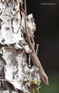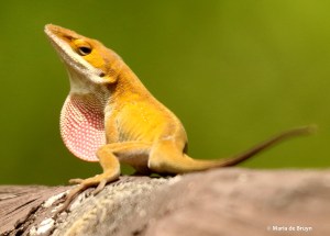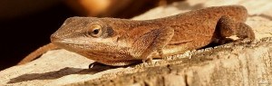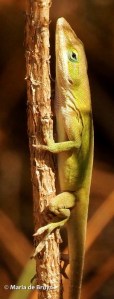 Also known as green anoles, they are the only anoles native to the southeastern United States. Green is nevertheless not their only color. You may encounter dark brown, light brown and green/brown anoles and they might even change their coloring as you watch them.
