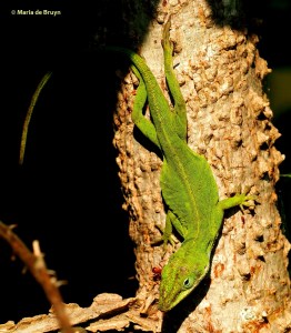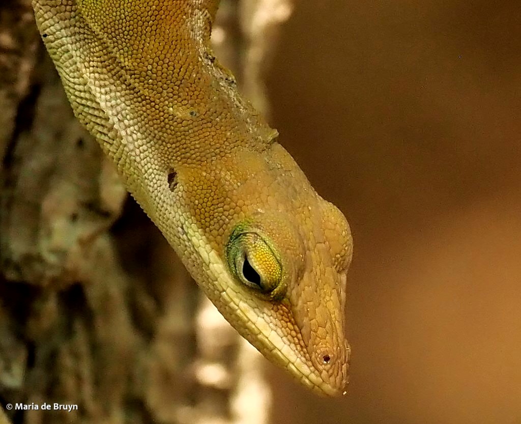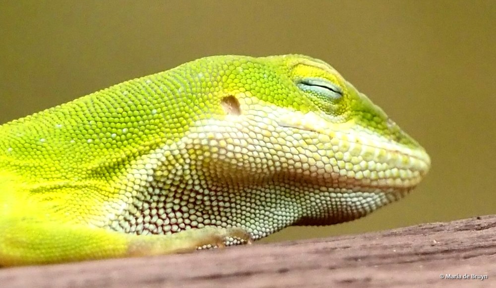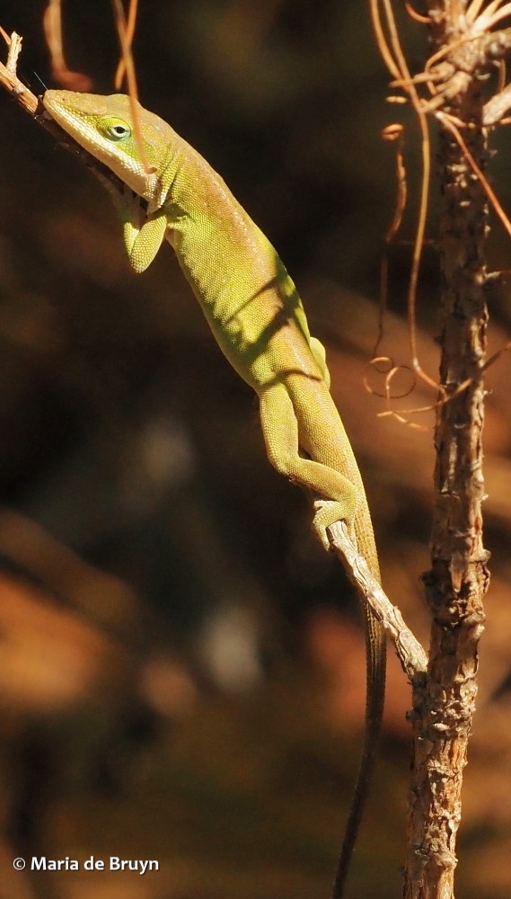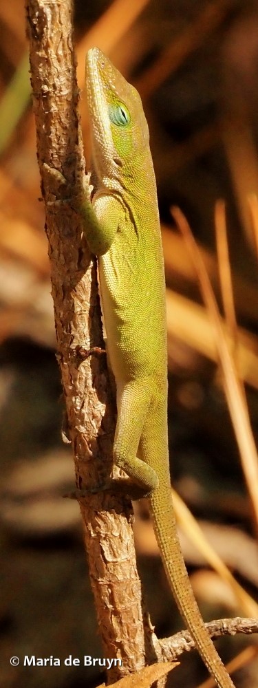 Also known as green anoles, they are the only anoles native to the southeastern United States. Green is nevertheless not their only color. You may encounter dark brown, light brown and green/brown anoles and they might even change their coloring as you watch them.