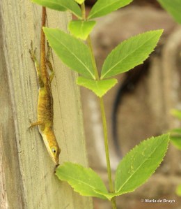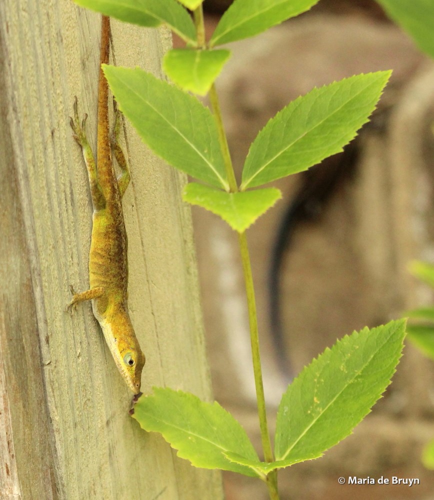 What nice photos of anoles! Your yard would be a perfect place for them to live and multiply. I really like them, too, and was very pleased this summer to see that my one anole of last summer had become two and had been joined by a 5-lined skink. They lived on my front porch, and I would often see them basking on the sunny railing and drinking from the plant saucer that I keep filled with water for the birds also on the railing.