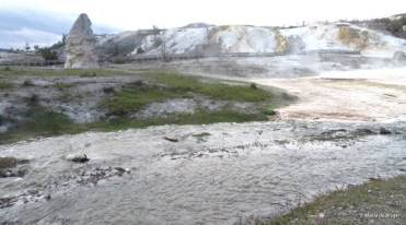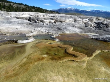 Carrie Strayhorn wrote, after her 1882 visit to YNP, that both men and women clambered all over the mineral deposits. She and her party traveled about 400 miles on horseback through the park, leaving her with memories of “the charms of nature which go with the wilderness and wonders in all their primal glory.” Strayhorn visited Mammoth Hot Springs and we made that our first stop. (Photo from “Fifteen Thousand Miles by Stage (1911) by Carrie Adell Strahorn)