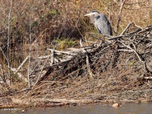 Finally, I noticed the great blue heron perched on the beaver lodge, not moving a muscle or feather. Its statue imitation was impressive. I began walking back and forth along the shore, hoping to spot wildlife but the cold even had the bugs laying low.