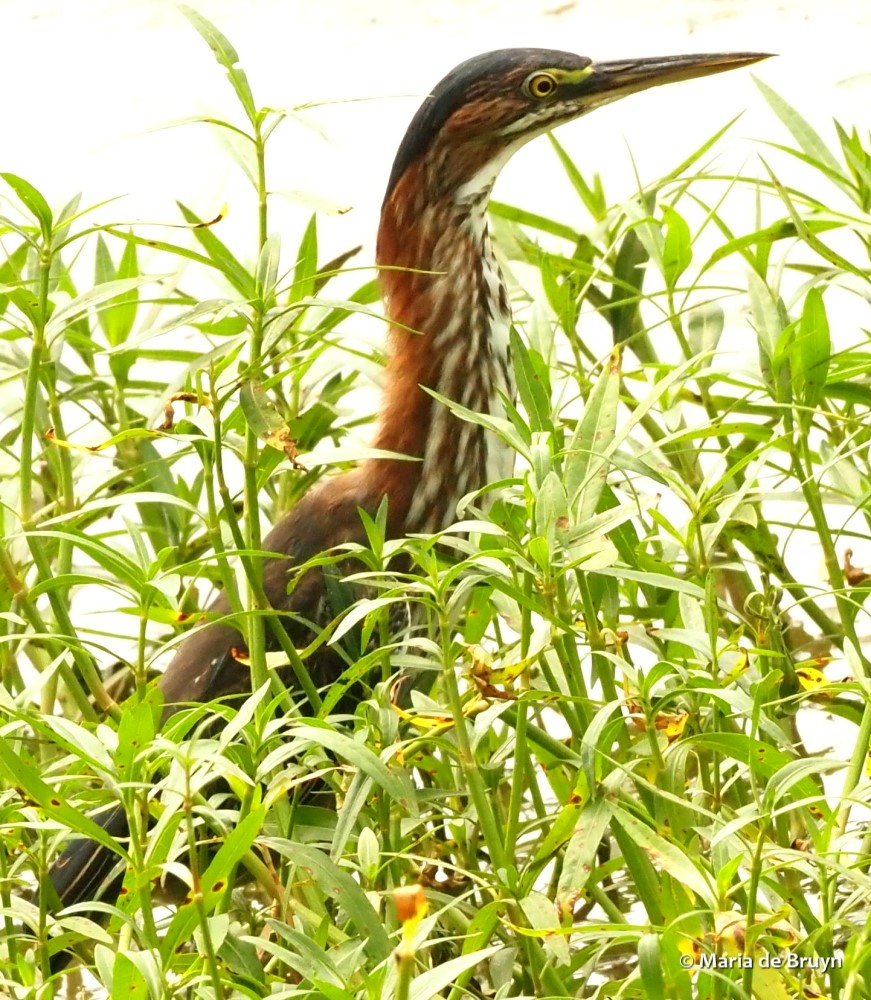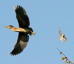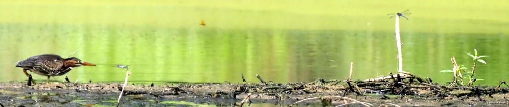 I tried to follow along on the other side of the pond and caught glimpses of them until they disappeared into a vegetation-heavy area of the pond. The heron kept following them so they must have been good guides to where the foraging was rewarding.