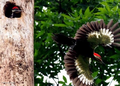 The three nestlings appeared to be producing numerous fecal sacs so that mom and dad were constantly checking the nest for them and flying them away.