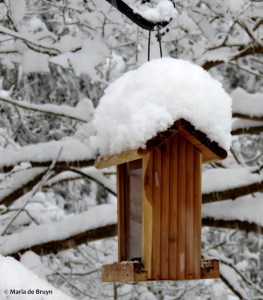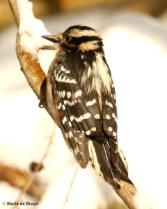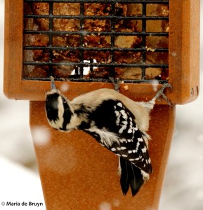 It’s my good fortune to live in a home with sizeable front and backyards where I can entice birds to spend time. Nest boxes border the yards and nesting gourds hang on the front porch, so that attracts pairs who raise young ones here in the spring. They also use these nesting sites to spend the night during cold autumn and winter nights. Downy woodpeckers (Dryobates pubescens) seem especially fond of one nest box next to the driveway.