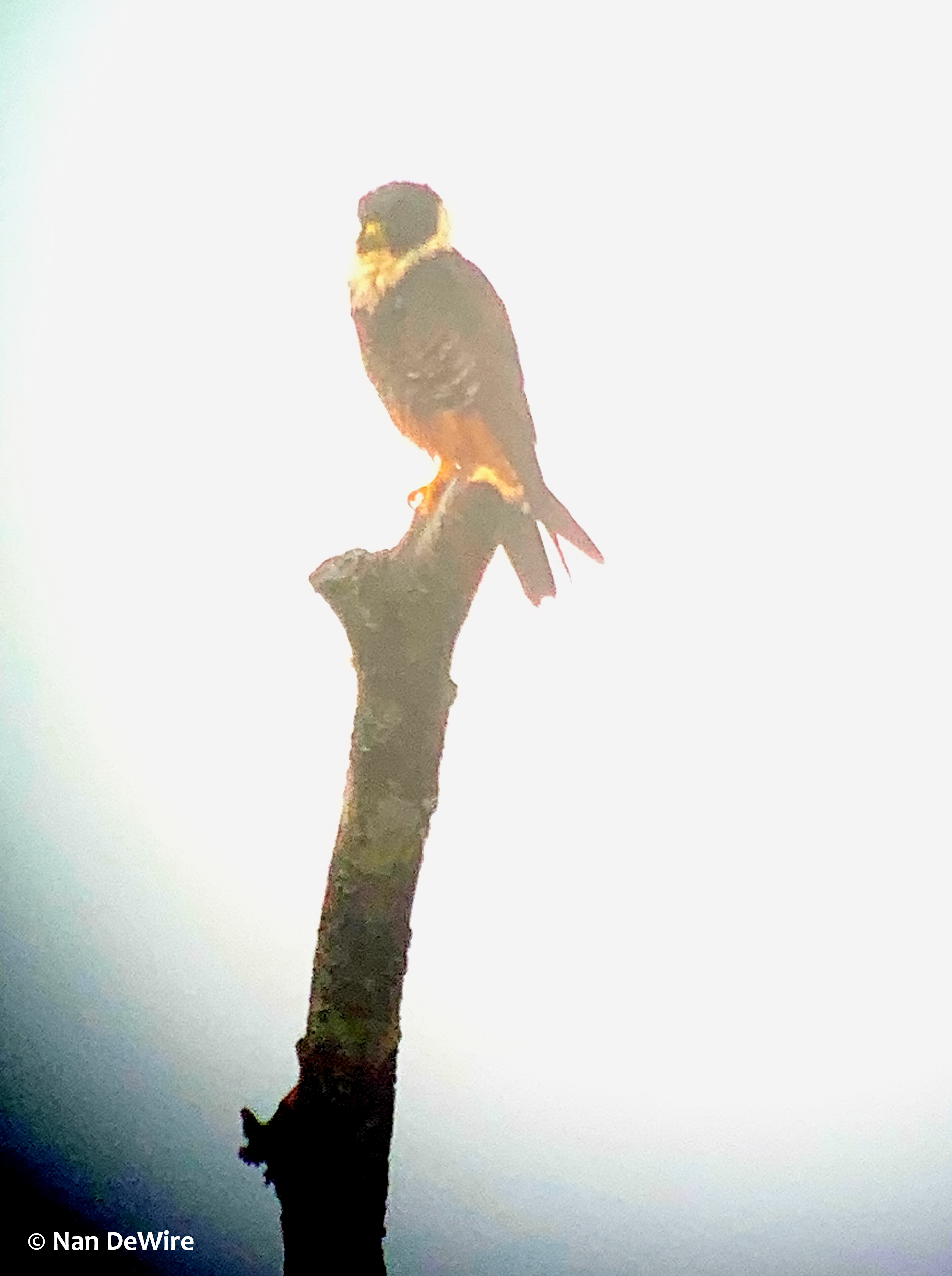 Another type of nocturnal bird related to nightjars (but also not considered a raptor) is the potoo. In 2018, Steve found us a common potoo (Nyctibius griseus) perched atop a snag along a very dark, unlit country road. This past August, we saw one perched high above us in a tree during the daytime. When this insectivore perches on a snag during the day, it often blends in so well and remains so completely motionless, people often don’t see it because it looks like it is part of the stump or snag!