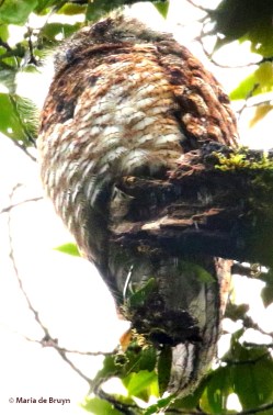 Our trip guide, Steve, had heard at one reserve that a pair of mottled owls (Ciccaba virgata) were perched in a tree near a trail. They were exactly where predicted and though the heavy, dark vegetation made for a difficult view, we could see the two resting comfortably. These medium-sized owls lack ear tufts.