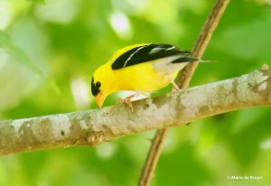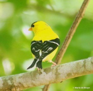 Many birds love sunflower seeds, but it can be difficult to see the foragers as they may be dining at blooms lower down on stems. The bright blue indigo buntings are sometimes easy to spot but I couldn’t get photos of them feeding. Red-winged blackbirds (Agelaius phoeniceus) and American goldfinches (Spinus tristis) will often perch atop a bloom to peck away at the ripening seeds.