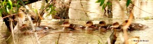 No ducklings followed and I feared the worst. One mother had five ducklings (above) while the one swimming away had lost one a few weeks before. Now I wondered if she had lost others, too. Luckily, I later saw her return to the area and shepherd four ducklings across the water to the other side.