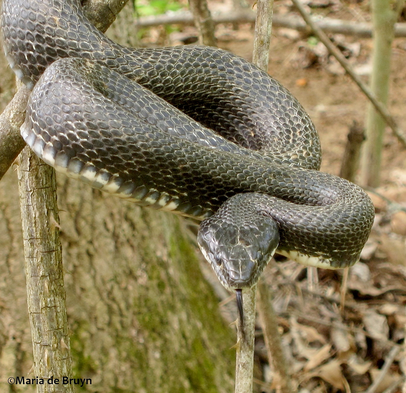 Knowing all this made me incredibly grateful that I encountered this snake on a cool early morning. Just before a nature walk, I needed to relieve myself badly and snuck off a path to do so before other hikers arrived. Perhaps distracted by the idea that someone might come upon me in an ungraceful position, I looked around quickly but obviously not thoroughly enough because as I half-squatted and looked down at my feet, I discovered my right foot was right next to this reptile. I backed away quietly but quickly and only later when I retrieved my camera from the car did I get a shot of this merciful snake.