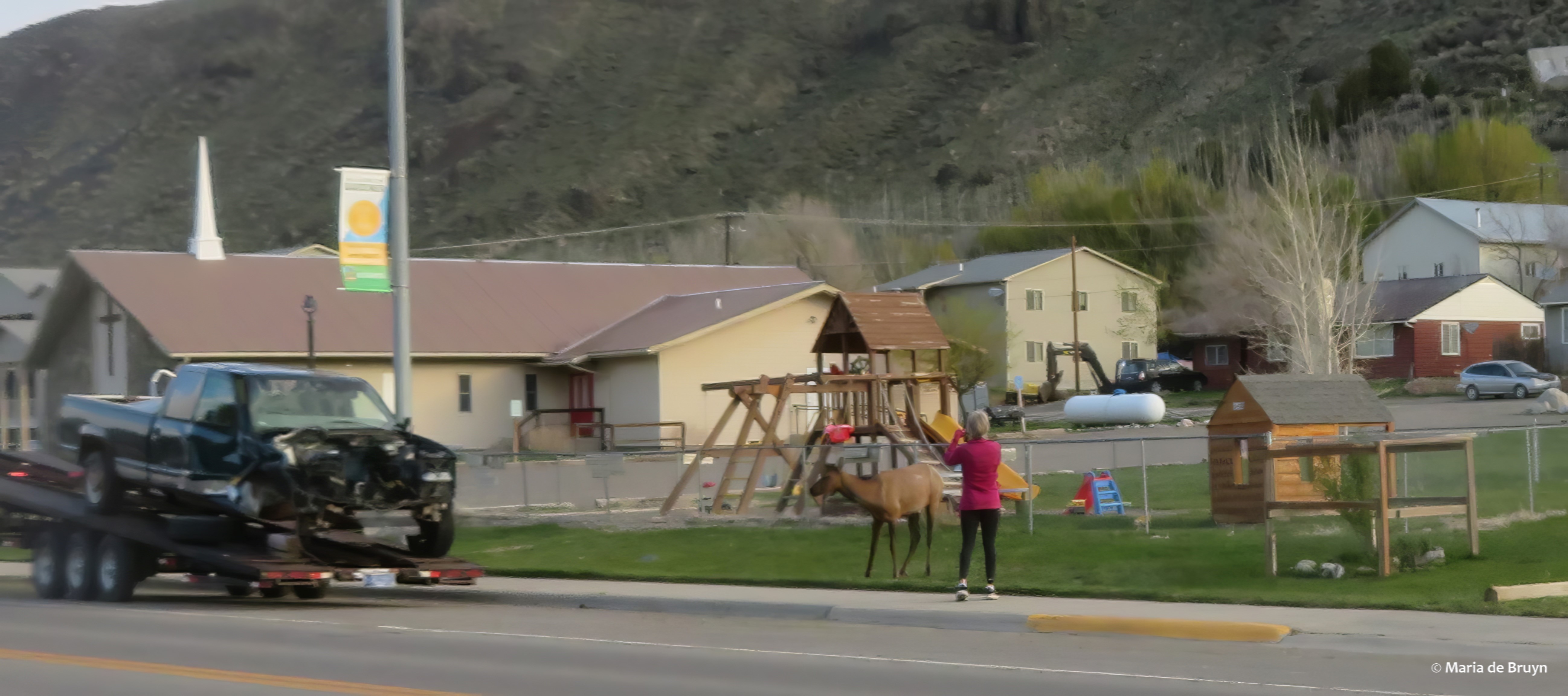 In Yellowstone, the larger ungulates on which the predators such as bears, coyotes and wolves feed include elk and moose. As mentioned in a prior blog, elk (Cervus canadensis) can be seen up close in Gardiner, the town at Yellowstone’s northern entrance, where they wander through the streets and rest in people’s yards. A more melodious name for them is wapiti, used by the Shawnee and Cree peoples. It refers to the animal’s white rump.