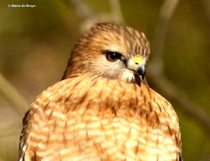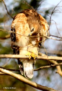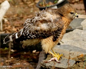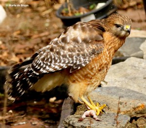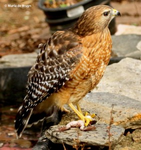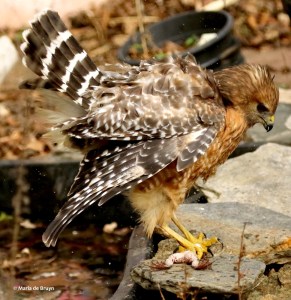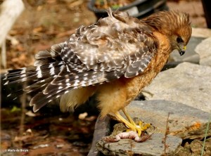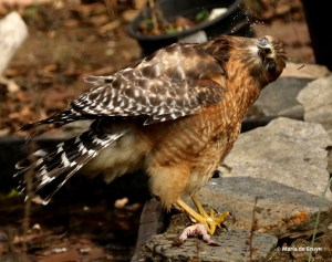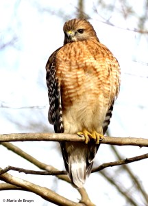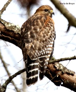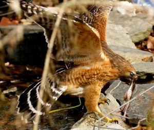Some weeks later, I saw a belted kingfisher (Megaceryle alcyon) fly by quickly with a frog dangling from its beak at a city park, but the bird was too far away for a good photo. I had had better photographic luck on another morning when I happened upon a red-shouldered hawk pursuing frogs at nature reserve pond.