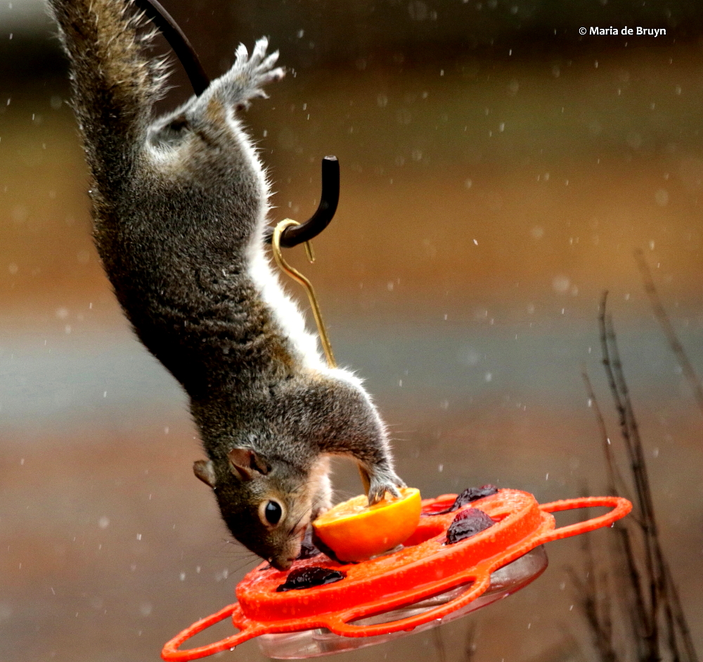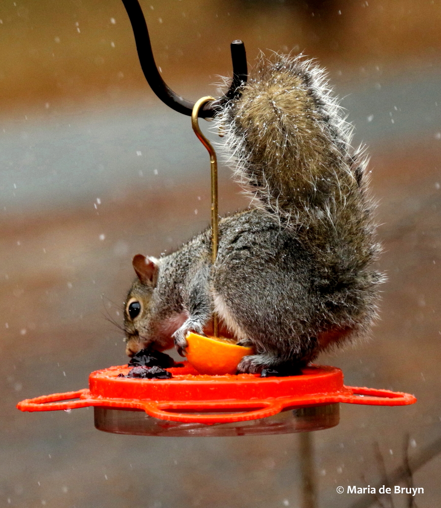I made the mistake of putting an oriole feeder on a pole without a baffle; I didn’t think it would attract the squirrels but apparently the jelly and nectar did appeal to one individual.