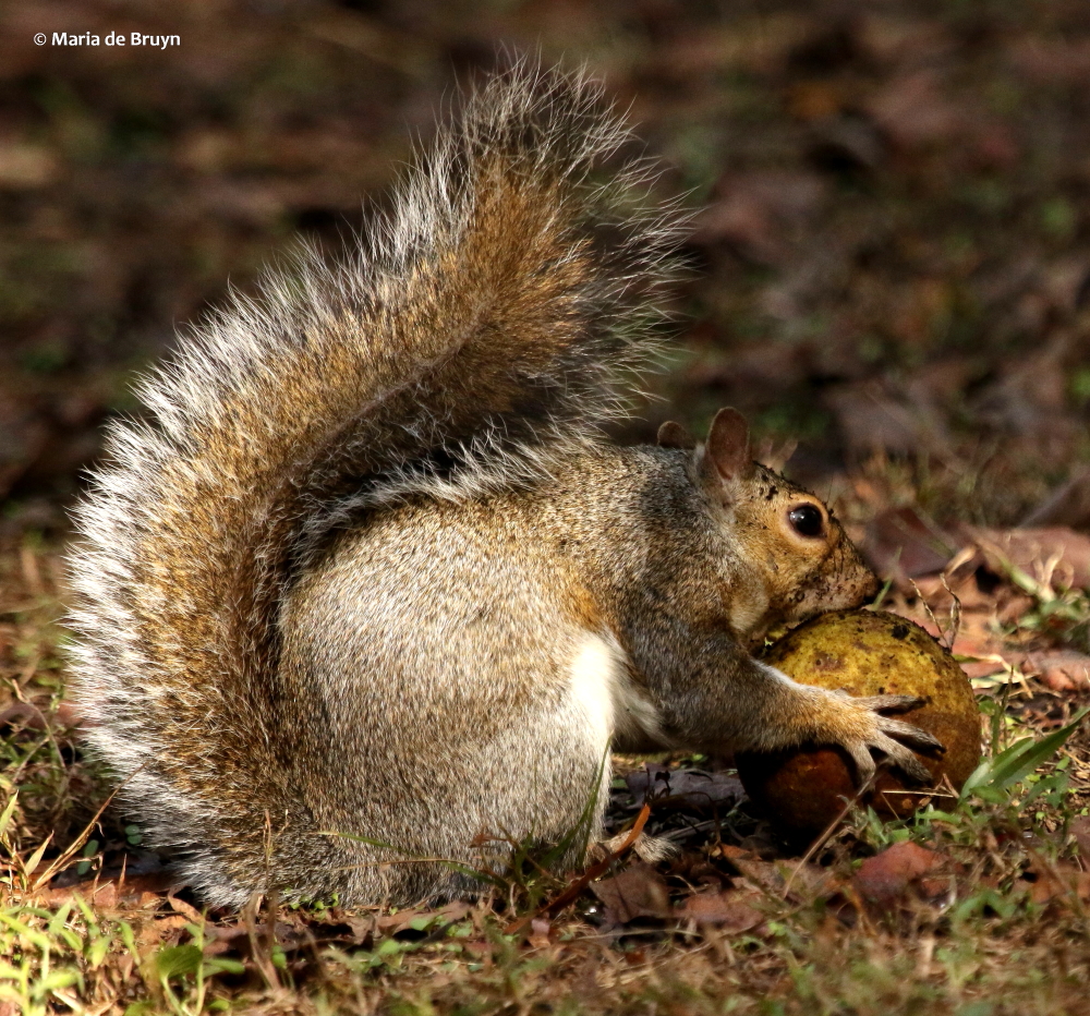 The next morning, I found a pile of walnut husks in the carport next to the plant pot. Then the next day, I saw one of the squirrels making off with the remaining walnut. Apparently, they can re-locate their hoarding caches partly by memory and partly by smell – so this squirrel must have discovered the tasty walnut by its odor (which I couldn’t detect at all).