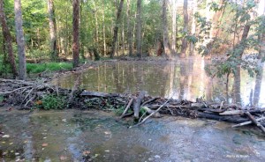 The beavers in a large pond that remains rather full have not moved; they are still felling trees, presumably to reinforce their lodge and to have some food supplies in stock for the winter. They also need to keep chewing as their teeth never stop growing. When they remove trees, they leave stumps of about 6-12 inches behind. I’ve seen some of these tree stumps, such as a tulip poplar, sprouting branches again. So the beavers’ tree clearing does not have the same effect as clear-cutting done by humans.
