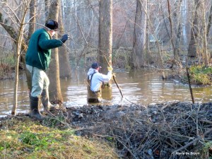 It appears that the beavers found the water flow too noisy, so each evening they would mud up the fencing around the deceiver intake so that no water could enter there. The humans would take away the mud; the beavers would put it back. The humans moved the pond leveling devices to deeper areas, but with heavy rainfall, the waters would rise very high.